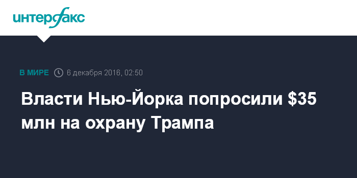 Москва. 6 декабря. INTERFAX.RU - Власти Нью-Йорка будут добиваться от федерального правительства возмещения расходов, которые город взял на себя для обеспечения безопасности избранного президента США Дональда Трампа во время избирательной кампании и после нее, пишет в понедельник The Washington Post. Речь идет о сумме в 35 млн долларов.