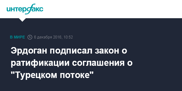Москва. 6 декабря. INTERFAX.RU - Президент Турции Реджеп Тайип Эрдоган подписал закон о ратификации заключенного с РФ соглашения о проекте газопровода "Турецкий поток", сообщают во вторник официальные турецкие СМИ.