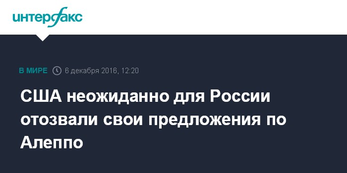 Москва. 6 декабря. INTERFAX.RU - США отозвали свои предложения по урегулированию ситуации в сирийском Алеппо, переданные российской стороне госсекретарем США Джоном Керри на прошлой неделе в Риме, заявил во вторник глава МИД России Сергей Лавров.