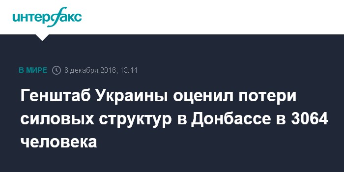 Москва. 6 декабря. INTERFAX.RU - За время проведения военной операции в Донбассе погибли 3064 сотрудников силовых структур Украины, сообщил начальник украинского Генштаба Виктор Муженко.