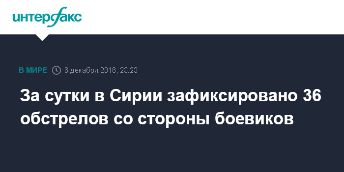 Москва. 6 декабря. INTERFAX.RU - В Сирии за прошедшие сутки зафиксировано 36 обстрелов со стороны вооруженных формирований, сообщает во вторник российский Центр по примирению враждующих в САР сторон.