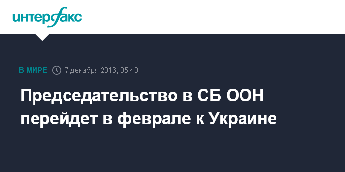Москва. 7 декабря. INTERFAX.RU - Украина будет председательствовать в Совете Безопасности ООН в феврале 2017 года, сообщает Всемирная организация.