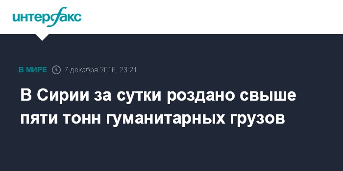 В населенных пунктах Раус-Флиско (провинция Латакия), Крейа (провинция Эс-Сувейда) и в районе Эн-Нейраб города Алеппо выдано по тонне "гуманитарки", в районе Шейх-Максуд города Алеппо - около 2,5 тонн; говорится в информационном бюллетене российского Центра по примирению враждующих сторон в Сирии, размещённом на сайте Минобороны РФ.