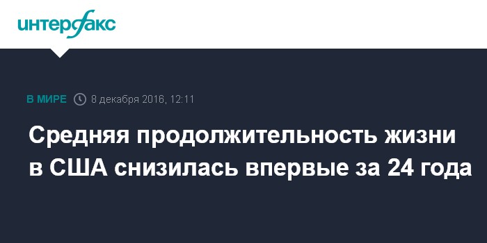 Москва. 8 декабря. INTERFAX.RU - Средняя продолжительность жизни в США в 2015 году сократилась впервые за более чем 20 лет, свидетельствует опубликованный в четверг доклад Национального центра статистики здравоохранения (NCHS).