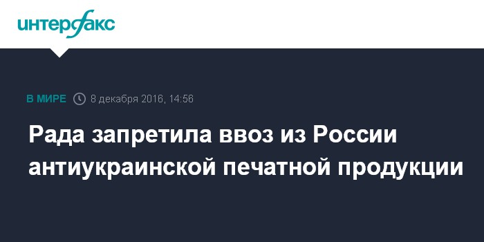 Москва. 8 декабря. INTERFAX.RU - Верховная рада Украины запретила распространение на территории Украины печатной продукции, пропагандирующей "государство-агрессора", и ограничила ее ввоз на территорию Украины из РФ.