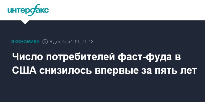 Москва. 8 декабря. INTERFAX.RU - Число американцев, побывавших в ресторанах быстрого питания, в третьем квартале снизилось на 1% в годовом выражении, продемонстрировав спад впервые за пять лет, сообщает MarketWatch со ссылкой на исследование компании NPD Group.
