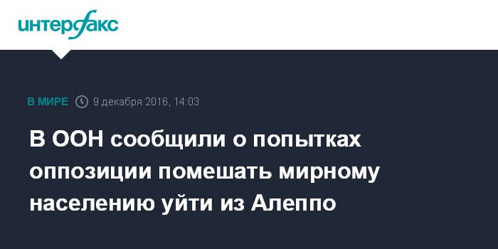 Москва. 9 декабря. INTERFAX.RU - Сирийские оппозиционные группировки, возможно, препятствуют попыткам мирных граждан уйти из восточной части Алеппо, заявил в пятницу пресс-секретарь управления Верховного комиссара ООН по правам человека (УВКПЧ) Руперт Колвилл.