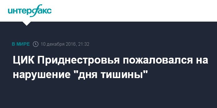 Москва. 10 декабря. INTERFAX.RU - Центризбирком непризнанной Приднестровской Молдавской республики (ПМР) попросил прокуратуру проверить Первый Приднестровский телеканал на нарушение "дня тишины". По информации ведомства, поводом для обращения стали многочисленные обращения от граждан республики. "Избиратели говорят о трансляции в эфире государственного телеканала пропагандистских фильмов, которые воспринимаются ими как агитация", - говорится в сообщении.