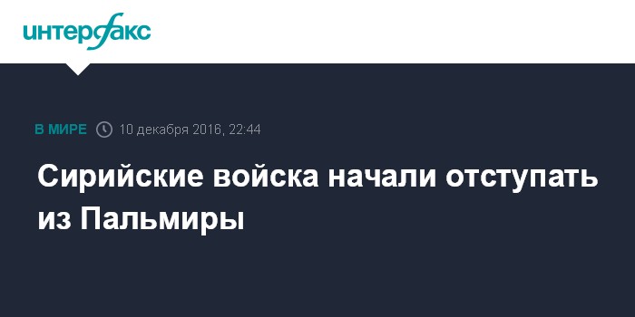 Москва. 10 декабря. INTERFAX.RU - Оставшиеся в Пальмире части Сирийской Арабской Армии начали отступать, чтобы избежать окружения боевиками группировки "Исламское государство", сообщило арабское издание "Аль-Масдар".