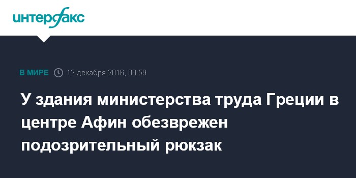 Москва. 12 декабря. INTERFAX.RU - Греческие полицейские в понедельник обезвредили подозрительный рюкзак, оставленный у министерства труда в центре Афин.