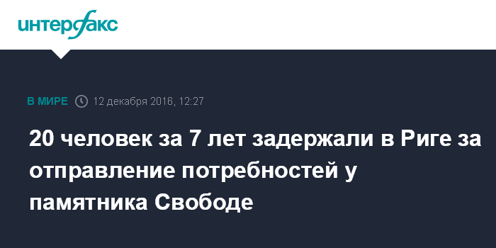 Москва. 12 декабря. INTERFAX.RU - За последние семь лет за отправление естественных потребностей у памятника Свободе в Риге задержано 20 человек, большинствоиз них - туристы, сообщили агентству BNS в полиции самоуправления столицы.