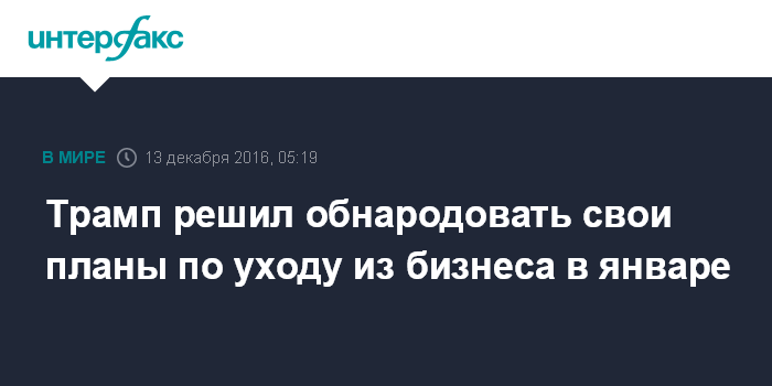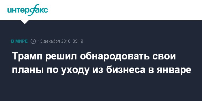 Трамп 30 ноября заявлял, что полностью уходит из бизнеса на период, пока будет находиться на посту главы государства. Он сказал, что идет на это ради того, чтобы избежать конфликта интересов. "Сейчас готовятся документы, подписав которые, я полностью выйду из бизнес-операций. Президентство - намного более важная задача", - написал он в Twitter.