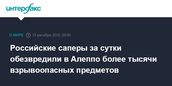 Москва. 13 декабря. INTERFAX.RU - Российские саперы в восточном Алеппо за сутки разминировали более 16 га, сообщили "Интерфаксу" во вторник в российском центре примирения враждующих сторон в Сирии.