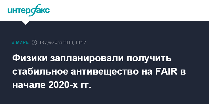 Москва. 13 декабря. INTERFAX.RU - В ходе экспериментов на строящемся в Германии ускорительном комплексе FAIR (Facility for Antiproton and Ion Research) в 2023 году планируется получить атомы и молекулы антивещества, заявил научный директор FAIR Борис Шарков журналистам во вторник.