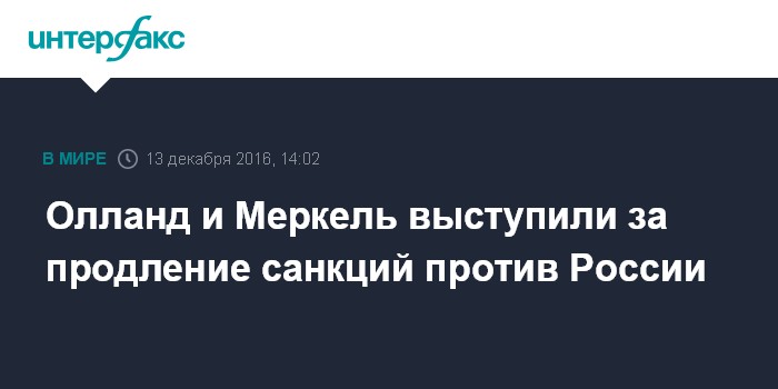 Москва. 13 декабря. INTERFAX.RU - Президент Франции Франсуа Олланд и канцлер Германии Ангела Меркель во вторник высказались в поддержку продления ограничительных мер в отношении РФ.