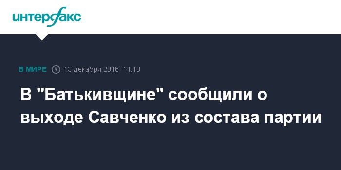 Москва. 13 декабря. INTERFAX.RU - Депутат Рады Надежда Савченко вышла из состава партии Всеукраинского объединения "Батькивщина", сообщил агентству "Интерфакс-Украина" парламентарий из этого объединения Иван Крулько.