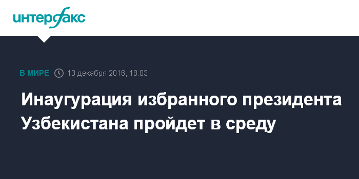 Москва. 13 декабря. INTERFAX.RU - Церемония инаугурации избранного 4 декабря президента Узбекистана Шавката Мирзиеева состоится в среду в Ташкенте в ходе совместного заседания Законодательной палаты и Сената Олий Мажлиса (верхняя и нижняя палаты парламента), сообщил во вторник "Интерфаксу" источник в парламенте.