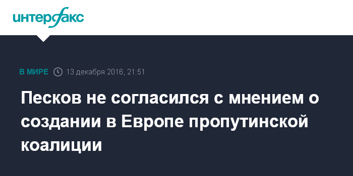 Москва. 13 декабря. INTERFAX.RU - Пропутинской коалиции в Европе нет, просто к власти в странах ЕС приходит все больше трезвомыслящих политиков, считает пресс-секретарь президента РФ Дмитрий Песков.