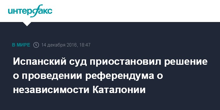 Москва. 14 декабря. INTERFAX.RU - Конституционный суд Испании приостановил постановление парламента Каталонии о проведении референдума о независимости в следующем году, сообщает The Local.