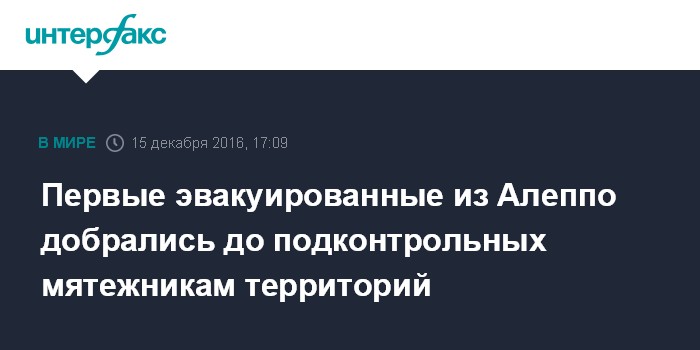 Москва. 15 декабря. INTERFAX.RU - Первая группа эвакуированных из Восточного Алеппо людей добралась до подконтрольных сирийским мятежникам территорий, сообщают европейские СМИ со ссылкой на собственные источники.