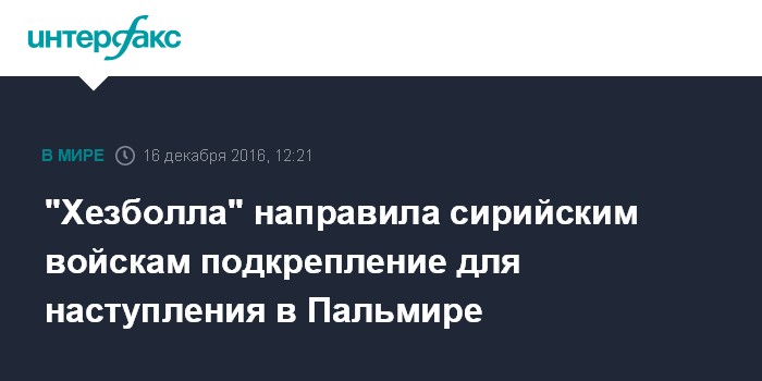 Москва. 16 декабря. INTERFAX.RU - Крупный контингент бойцов ливанской шиитской группировки "Хезболла" прибыл на сирийскую авиабазу "Т-4" в качестве подкрепления сирийской армии перед контрнаступленим на террористов в районе Пальмиры, сообщает в пятницу арабское издание "Аль-Масдар".