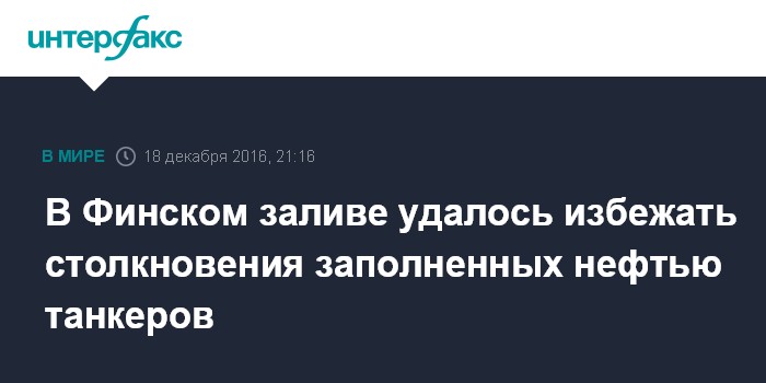Москва. 18 декабря. INTERFAX.RU - В Финском заливе благодаря своевременно предпринятым мерам удалось избежать столкновения двух танкеров. Как сообщил Департамент транспорта, угроза столкновения возникла около шести часов утра воскресенья к югу от порта Ханко.