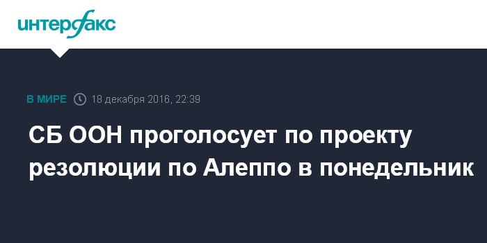 Москва. 18 декабря. INTERFAX.RU - Голосование по проекту резолюции СБ ООН относительной ситуации вокруг сирийского Алеппо состоится в понедельник, в 17:00 мск, сообщило постпредство РФ при ООН.