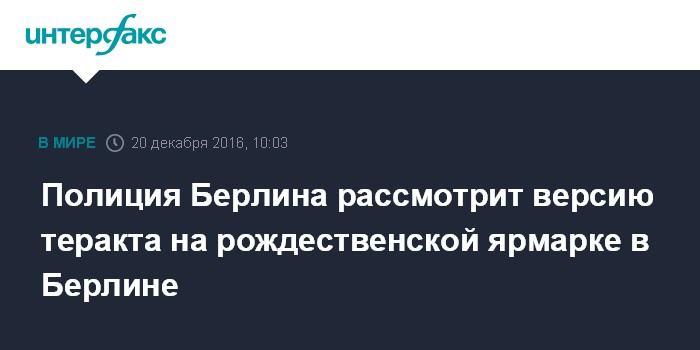 Москва. 20 декабря. INTERFAX.RU - Полиция Берлина предполагает, что водитель грузовика намеренно въехал в толпу, рассматривается версия теракта, сообщает Associated Press.