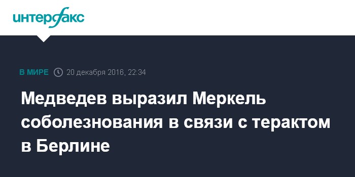 Москва. 20 декабря. INTERFAX.RU - Премьер-министр РФ Дмитрий Медведев выразил соболезнования канцлеру Германии Ангеле Меркель в связи терактом в Берлине, сообщила во вторник пресс-служба российского правительства.