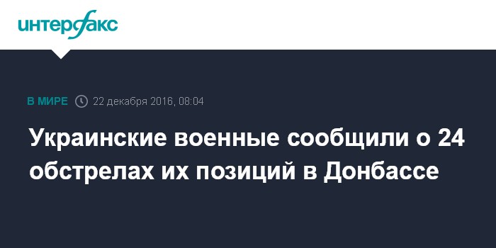 Москва. 22 декабря. INTERFAX.RU - За прошедшие сутки в зоне боевых действий в Донбассе позиции украинских военных обстреливались 24 раза, сообщает в четверг пресс-служба штаба силовой операции.
