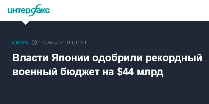 Москва. 22 декабря. INTERFAX.RU - Правительство Японии одобрило рекордный оборонный бюджет на 2017 финансовый год, который начнется 1 апреля, на фоне продолжающихся территориальных споров с Китаем и угроз со стороны КНДР, передает BBC. Объем средств, которые власти планируют потратить на оборону, составляет 5,13 трлн иен ($43,6 млрд) при общем объеме бюджета в 97,5 трлн иен ($830 млрд).