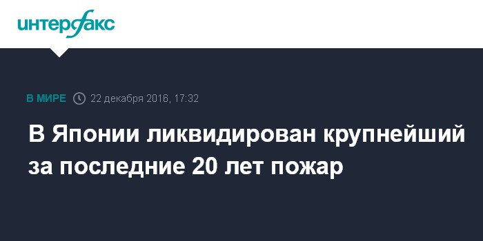 Москва. 22 декабря. INTERFAX.RU - Японским пожарным удалось ликвидировать пожар, который в четверг охватил значительную площадь в городе Итоигава (префектура Ниигата, остров Хонсю), сообщает японский телеканал NHK.