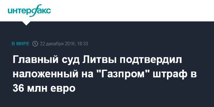 Москва. 22 декабря. INTERFAX.RU - Главный административный суд Литвы (ГАСЛ) в четверг вынес решение по апелляционной жалобе ПАО "Газпром" по поводу наложенного штрафа за отказ подписать с компанией Lietuvos energija (в настоящее время - Lietuvos energijos gamyba) договор об обмене газом, говорится в материалах суда.