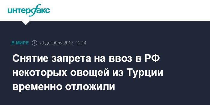 Москва. 23 декабря. INTERFAX.RU - Снятие запрета на ввоз некоторых видов овощей из Турции пока откладывается.