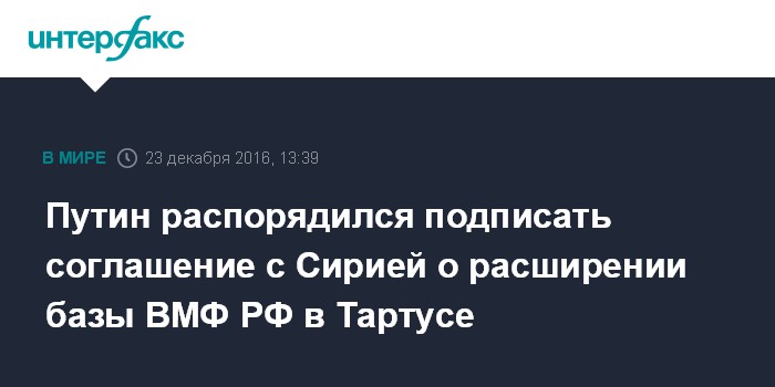 Москва. 23 декабря. INTERFAX.RU - Президент России Владимир Путин распорядился подписать соглашение между РФ и Сирией о расширении территории пункта материально-технического обеспечения Военно-морского флота РФ в районе порта Тартус и заходах военных кораблей РФ в территориальное море, внутренние воды и порты Сирии, сообщается на сайте Кремля.