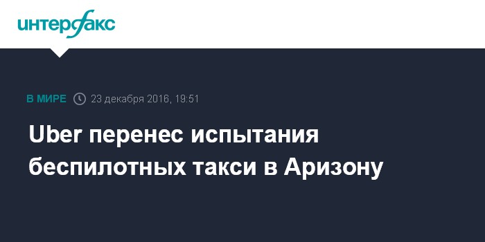Москва. 23 декабря. INTERFAX.RU - Компания Uber Technologies Inc. перенесла испытания беспилотных такси в Аризону после того, как регуляторы штата Калифорния отозвали у нее регистрацию на самоуправляемые автомобили.