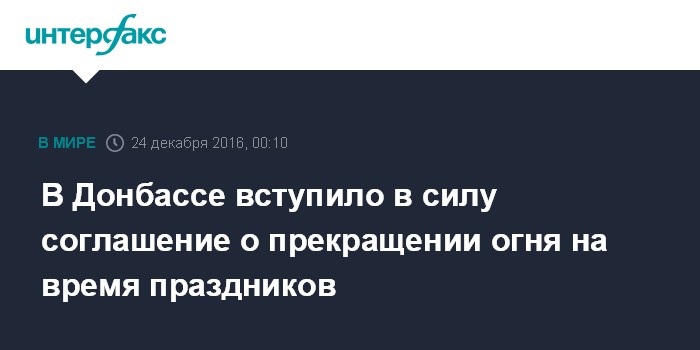 Москва. 24 декабря. INTERFAX.RU - Участники вооруженного конфликта в Донбассе намерены прекратить боевые действия на период рождественских и новогодних праздников с 24 декабря в соответствии с договоренностью, достигнутой на встрече контактной группы в Минске.