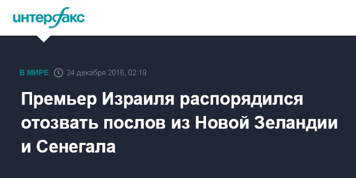 Москва. 24 декабря. INTERFAX.RU - Премьер-министр Израиля Биньямин Нетаньяху распорядился отозвать послов из Новой Зеландии и Сенегала для консультаций, сообщает в субботу The Jerusalem Post. Таким образом он отреагировал на принятие СБ ООН выдвинутой этими странами резолюции об израильских поселениях на палестинских землях.