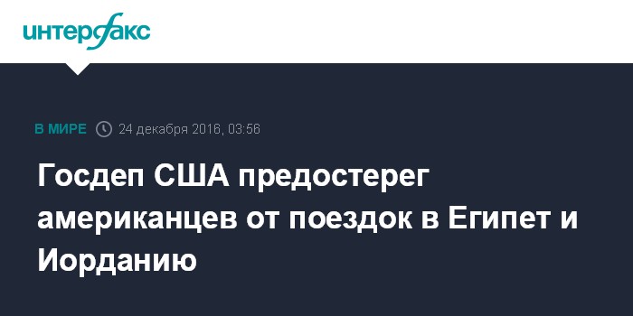 Москва. 24 декабря. INTERFAX.RU - Государственный департамент США предостерег американцев от поездок в Египет, Иорданию и Мали из-за напряженной обстановки в этих странах, говорится в заявлениях, опубликованных в пятницу на сайте внешнеполитического ведомства.