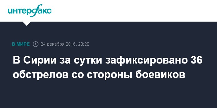 Москва. 24 декабря. INTERFAX.RU - В Сирии боевики совершили за прошедшие сутки 36 обстрелов в пяти провинциях страны, сообщает в субботу российский Центр примирения враждующих в САР сторон.