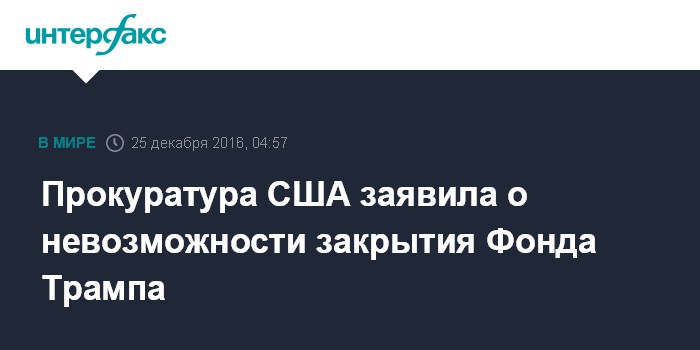 Москва. 25 декабря. INTERFAX.RU - Избранный президент США Дональд Трамп не сможет распустить фонд своего имени, пока в отношении организации ведется расследование. Об этом в твиттере сообщила пресс-секретарь главного прокурора Нью-Йорка Джона Шнайдермана Эми Спиталник, отказавшись называть сроки завершения расследования.