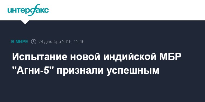 Москва. 26 декабря. INTERFAX.RU - Запуск индийской межконтинентальной баллистической ракеты "Агни-5", способной нести ядерную головную часть, прошел успешно, сообщает в понедельник Times of India.
