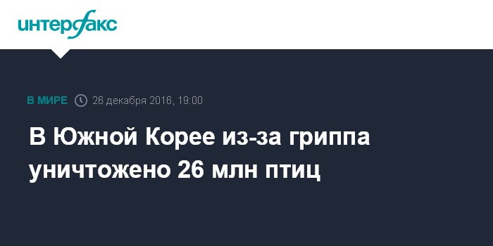 Москва. 26 декабря. INTERFAX.RU - В Южной Корея распространение гриппа птиц привело к уничтожению 26 млн кур и уток. В борьбу с высокопатогенным вирусом гриппа птиц H5N6 включается армия, сообщают в понедельник западные СМИ.