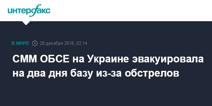 Москва. 28 декабря. INTERFAX.RU - Специальная мониторинговая миссия ОБСЕ на Украине на два дня вынужденно эвакуировала свою патрульную базу из Светлодарска в связи с обстрелами, говорится в отчете миссии за 22-26 декабря, опубликованном во вторник.
