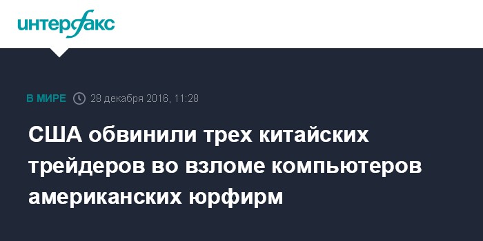 Москва. 28 декабря. INTERFAX.RU - Власти США предъявили обвинения трем китайским трейдерам, которые якобы незаконным образом получили $4 млн прибыли, взломав компьютерные системы крупных американских юридических фирм и украв конфиденциальную информацию о слияниях и поглощениях.