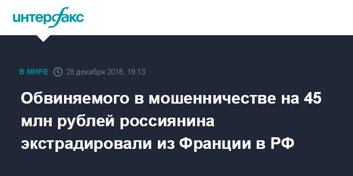 Обвиняемого в мошенничестве на 45 млн рублей россиянина экстрадировали из Франции в РФ