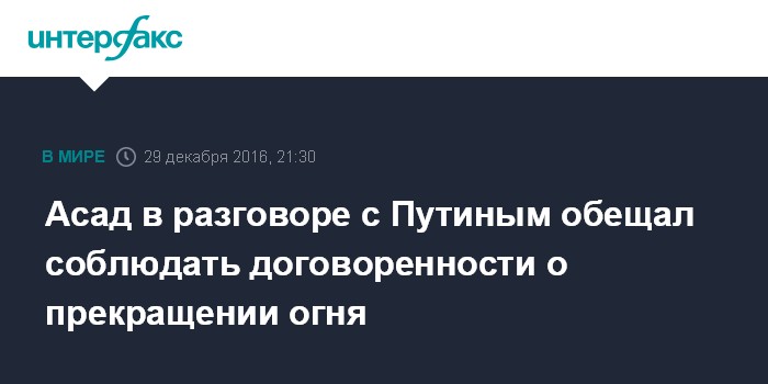 Асад в разговоре с Путиным обещал соблюдать договоренности о прекращении огня