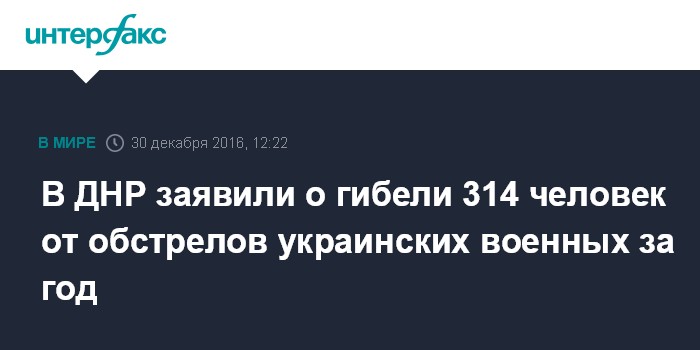 Москва. 30 декабря. INTERFAX.RU - За год от обстрелов украинскими военными территории самопровозглашенной Донецкой народной республики в ДНР погибли 314 человек, получили ранения 406 человек, разрушены 820 зданий, сказал журналистам заместитель командующего оперативным командованием ДНР Эдуард Басурин.