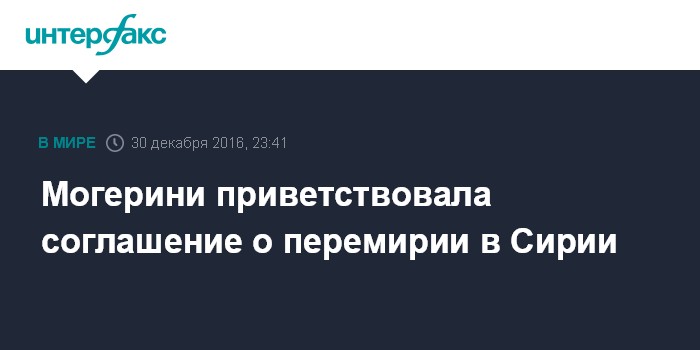 Москва. 30 декабря. INTERFAX.RU - Объявление о соглашении по прекращению военных действий в Сирии в преддверии Нового года можно только приветствовать, говорится в заявлении высокого представителя ЕС по иностранным делам Федерики Могерини.
