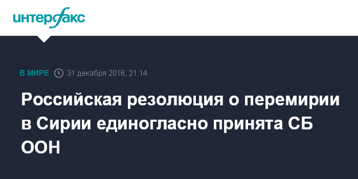 Москва. 31 декабря. INTERFAX.RU - Российский проект резолюции касательно договоренностей о перемирии в Сирии принят в последний день 2016 года членами Совета Безопасности единогласно.